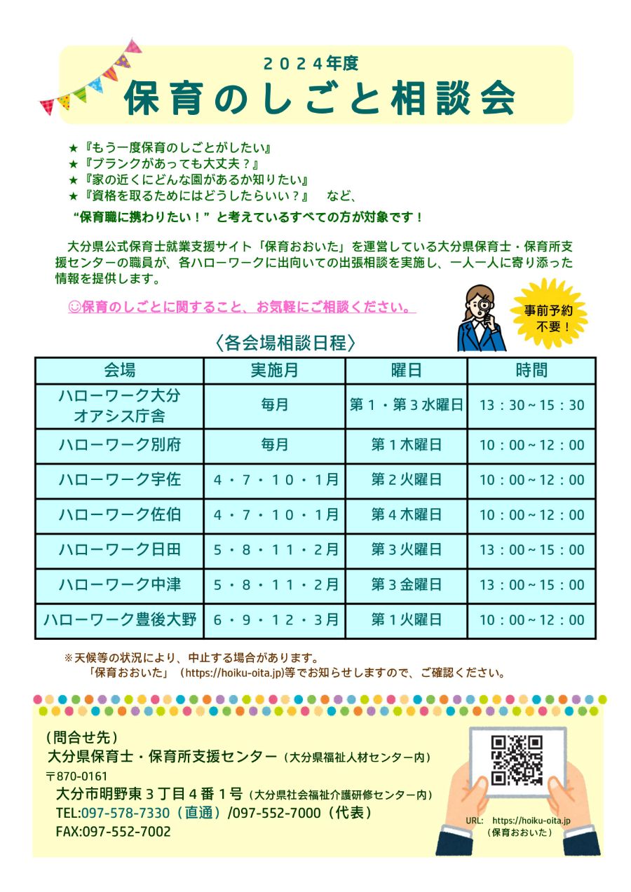 【2024年度】保育のしごと相談会日程 2024年3月12日 求職者のみなさま 2024年度 保育のしごと相談会日程 *2024年度の相談会日程が決定いたしました! お近くの地域で開催される際は、ぜひ気軽にお話をしに立ち寄ってくださいね♪ お待ちしております。 ・天候等の状況により中止になる場合があります。「保育おおいた」にて月ごとの日程表もご確認ください。 ・感染症対策のため、マスクの着用をお願いします。